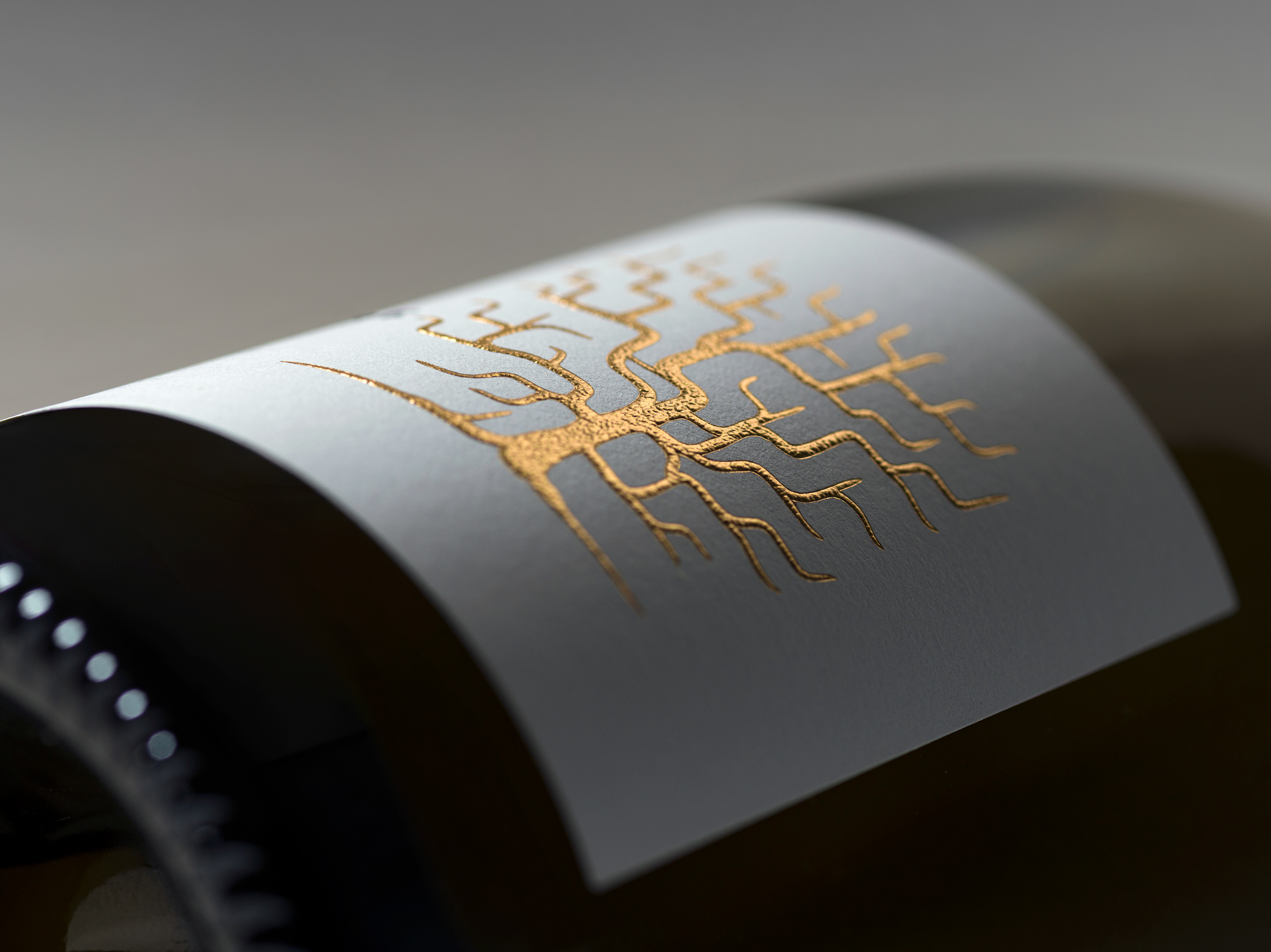 Il concept nasce dall’immagine di una vite centenaria, simbolo di resistenza, memoria e radicamento. Il segno dorato, la cui texture incisa nella lamina rimanda alla corteccia della vite, evoca anche il tracciato contorto delle sue radici, un intreccio vitale che si confonde con le fratture della roccia vulcanica.