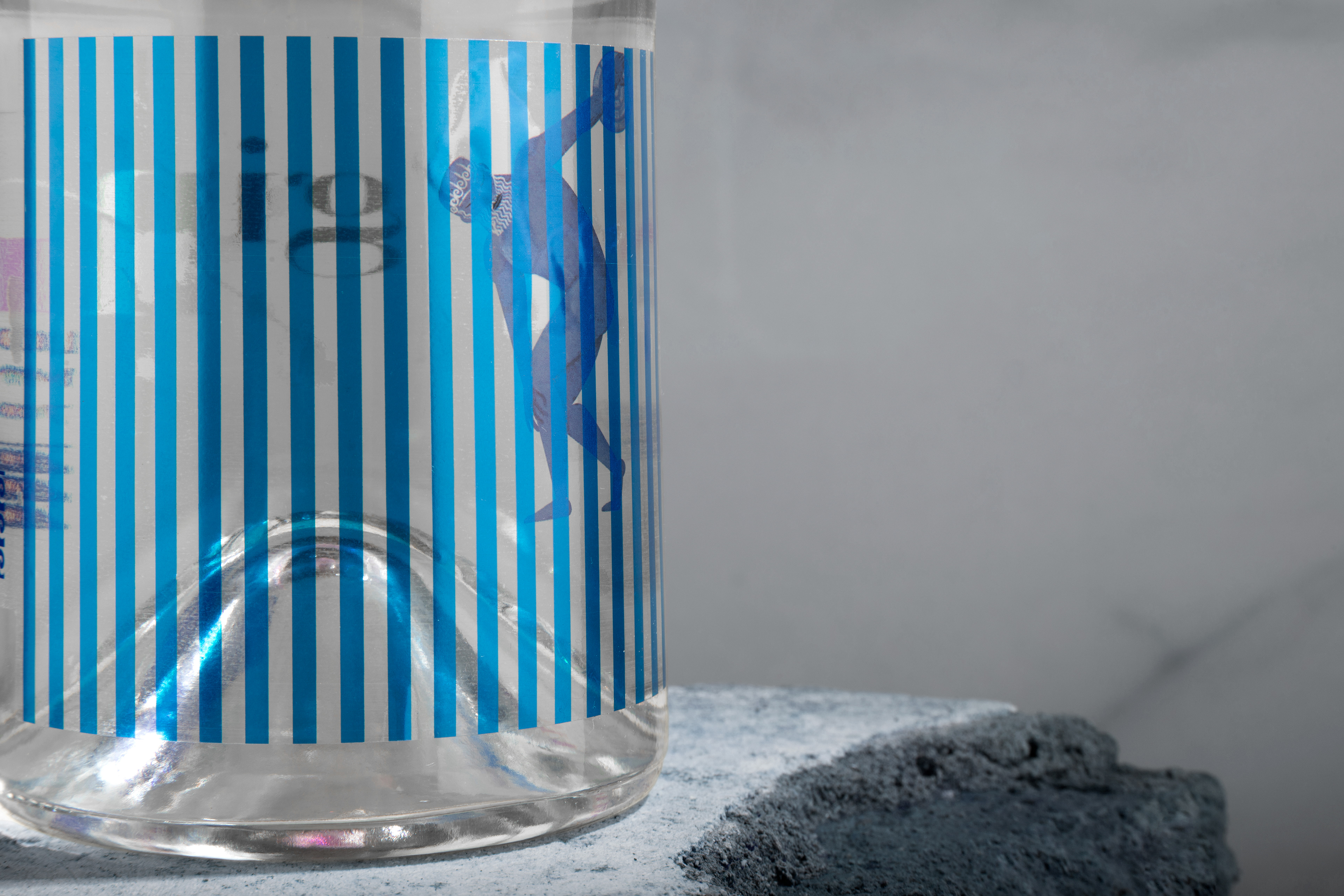 Le linee verticali poste sul retro della bottiglia rappresentano le scanalature della colonna, si deformano inseguendo la volumetria del vetro, facendo da sfondo al nostro atleta, evocato e anch’esso deformato dal lungo viaggio dal passato.
