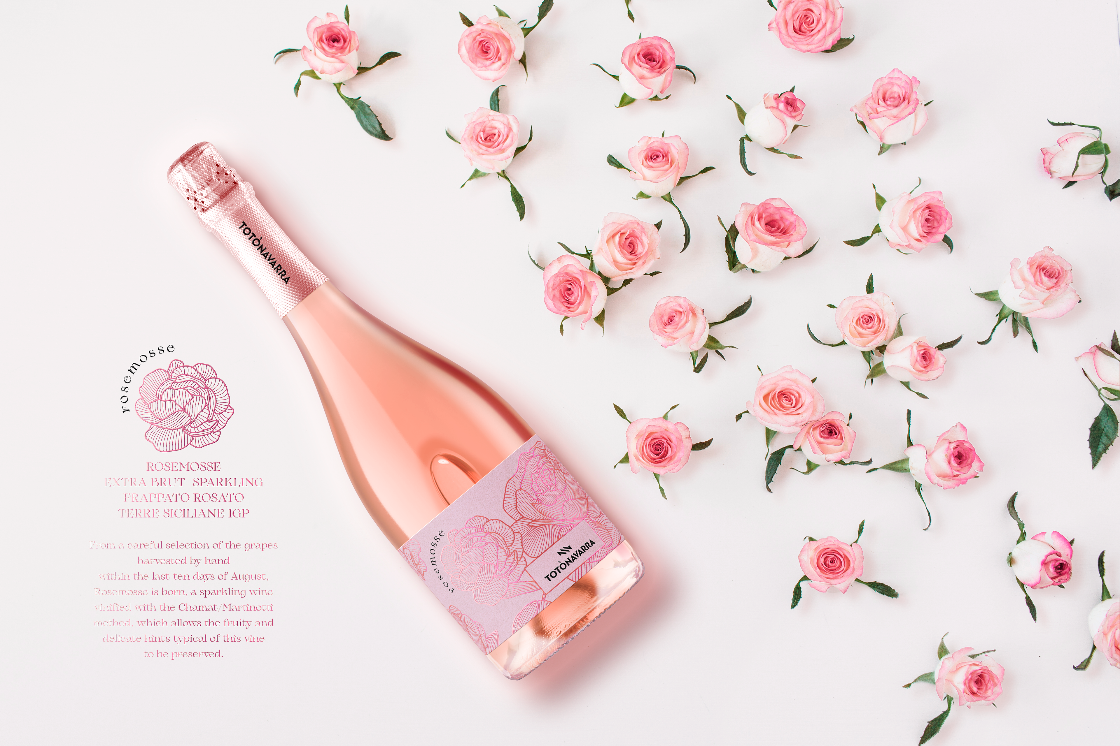 "Un’ode visiva alla leggerezza e alla vitalità. Una bottiglia di spumante rosato emerge come fiore di vetro, sospesa in un dialogo con rose delicate e petali in movimento. La luce accarezza la scena come un’alba mediterranea, restituendo bagliori dorati e riflessi cipria. Lo spazio è essenziale, arioso, quasi sospeso, per evocare la purezza del gesto artigianale e la freschezza del territorio siciliano. Lo still life diventa un racconto di effervescenza e poesia, dove ogni dettaglio – un petalo, una bollicina, un riflesso – celebra l’armonia tra natura, vino e tempo."